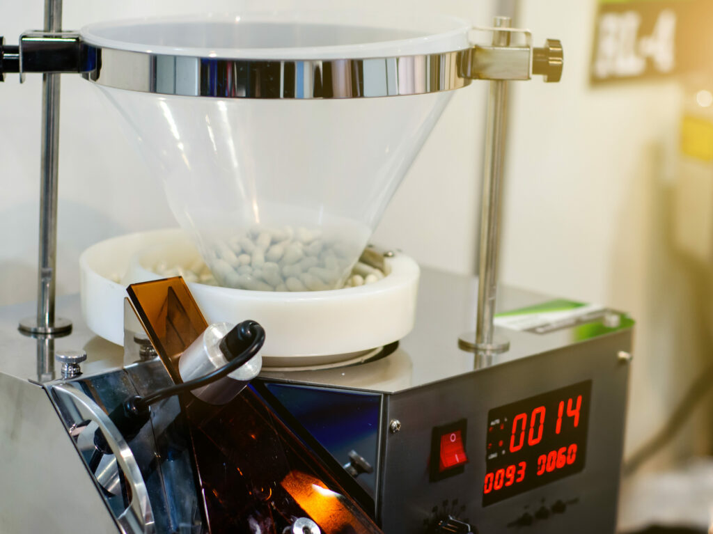 A bench-top medical instrument used a vibration motor to aid the movement of pills through instrument pathways.