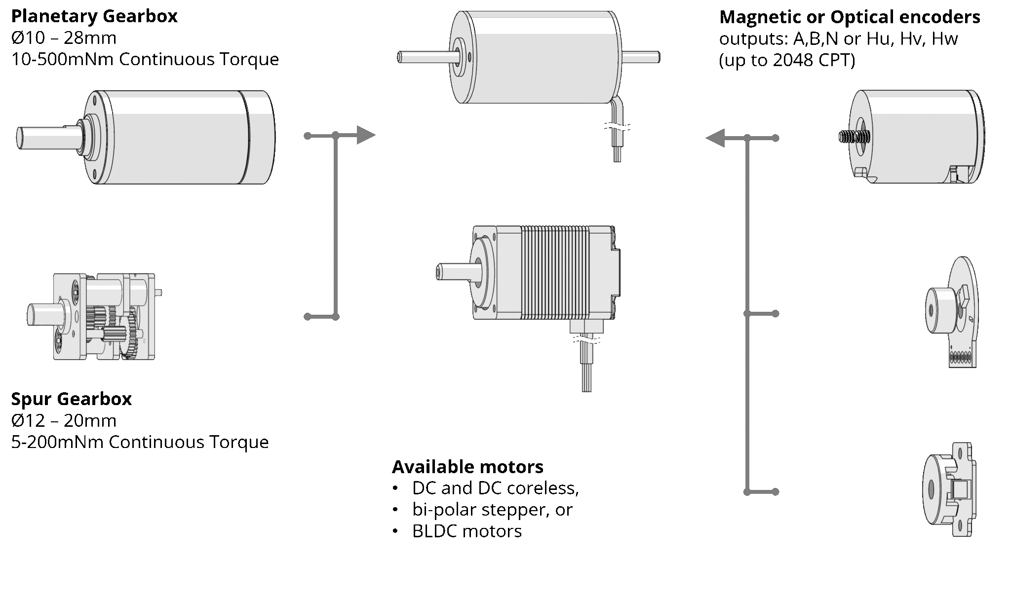 Our range of gearboxes are designed to integrate onto our ranges of motors (coreless, brushless, brushed, and stepper), and encoders. Please contact us so that we can prepare an fully integrated turn-key drive solution.